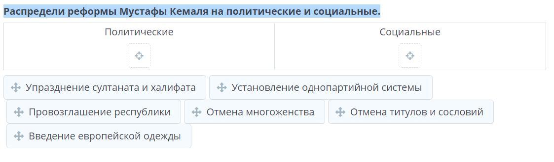 Политические: провозглашение республики, упразднение султана и халифата, установление однопартийной системы.