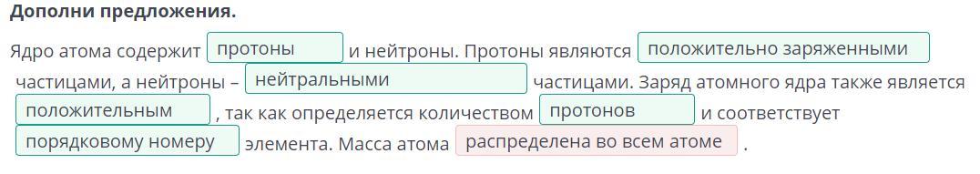 Дополни предложения. Ядро атома содержит протоны и нейтроны. Протоны являются ......... частицами, а нейтроны – .......... частицами. Заряд атомного ядра также является .......... , так как определяется количеством ....... и соответствует