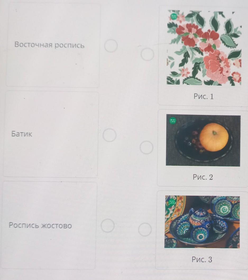Восточная роспись-это рис.3 голубые чашки,чайник. Батик-это рис.1 красно-розовые цветочки с зелёными листьями. Роспись жостово-рис.2 это поднос с тыквой. Надеюсь я Вам помогла.Ставьте в благодарность оценки,сердечки
