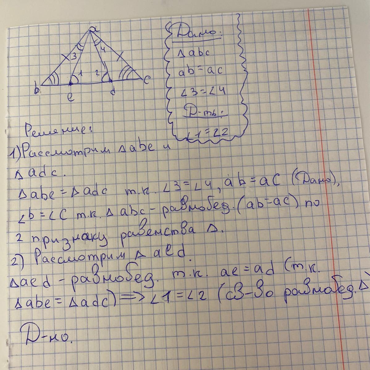 aed- Равнобедренный треугольник т.к. ае=ad (тк треугольник abe= abc) => <1=<2 (св-во равнобедренного треугольника)