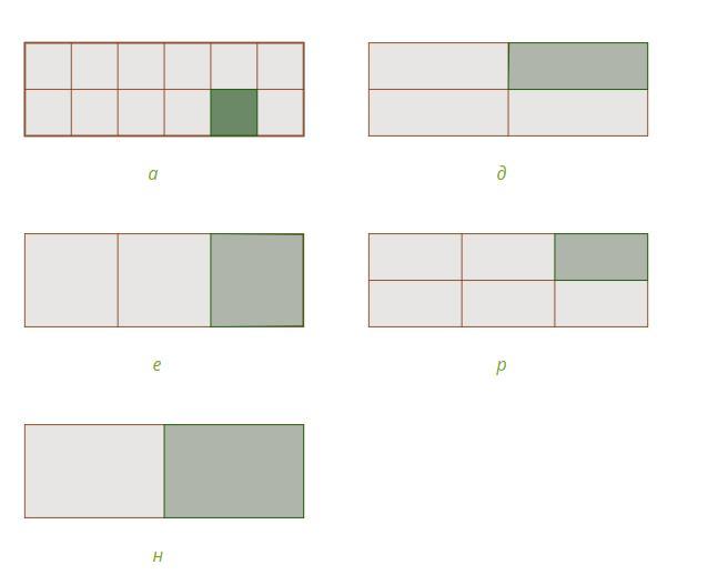 Рассмотри закрашенные доли прямоугольника в порядке их уменьшения и, в соответствии с этим, запиши буквы. Получится зашифрованное слово.