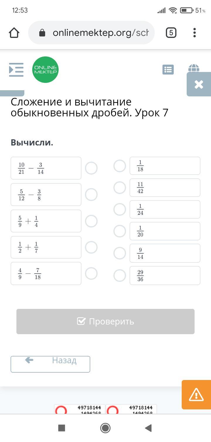 10/21-3/14:11/42 5/12-3/8:1/24 5/9+1/4:29/36 1/2+1/7:9/14 4/9-7/18:1/18 сама праверила в онлайн мектем