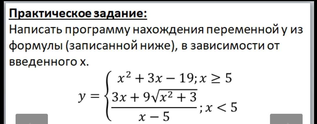 Если условие х < 5 истинно, то вычисляем у по формуле y:=(3*x+9*sqrt(sqr(x)+3))/(x-5), иначе вычисляем у по формуле y:=x*x+3*x-19