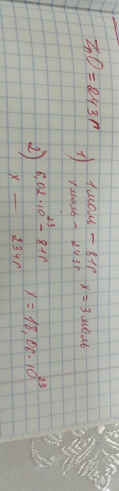 Рассчитайте количество вещества, число молекул в образце оксида цинка массой 243 г