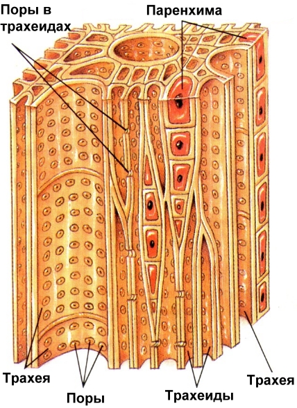 б) сосуды---Проводящая----Клетки с толстыми боковыми стенками, поперечные перегородки у которых разрушились, образуют длинные сосуды (трахеиды). По ним осуществляется восходящий ток воды с минеральными веществами.