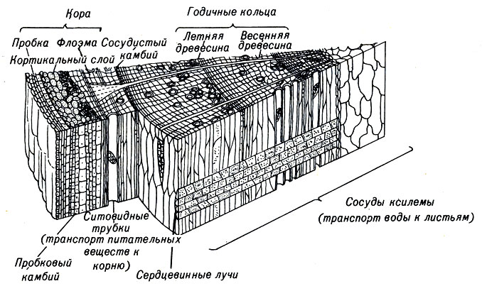 в) сердцевинные лучи-----Запасающая----Отложение запасов и передвижение веществ в поперечном направлении. Они начинаются от сердцевины и проходят в радиальном направлении через древесину и луб.