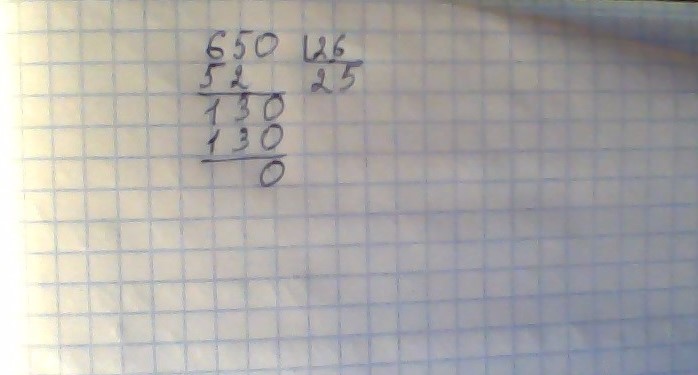 сначала 2 умножаем на 26(получаем 52) вычитаем из 65-52=13 (0 вниз смещаем) получаем 130 и чтобы получить 130 мы должны 26*5=130. ответ 650/26=25