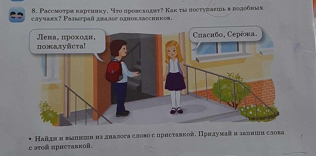 • Найди и выпиши из диалога слово с приставкой. Придумай и запиши слова