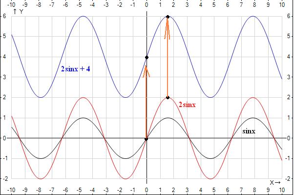 Преобразования: sinx -> 2sinx (график сжали в два раза) -> 2sinx + 4 (график подняли на 4 единицы вверх) (см. рисунок)