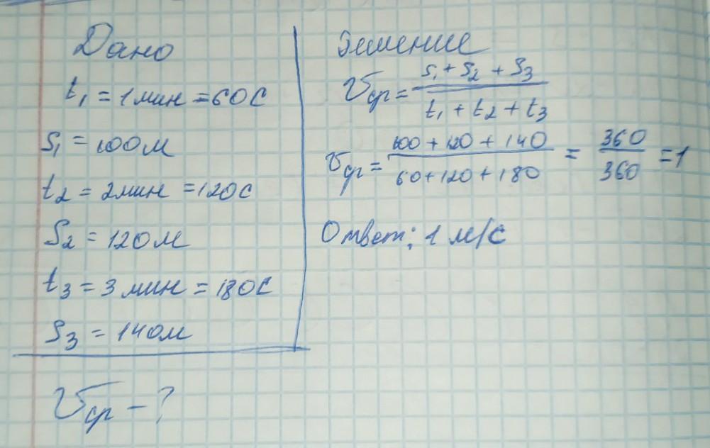 Пешеход за минуту прошел 100м, за вторую 120м и за третью 140м. Вычислите среднюю скорость пешехода?