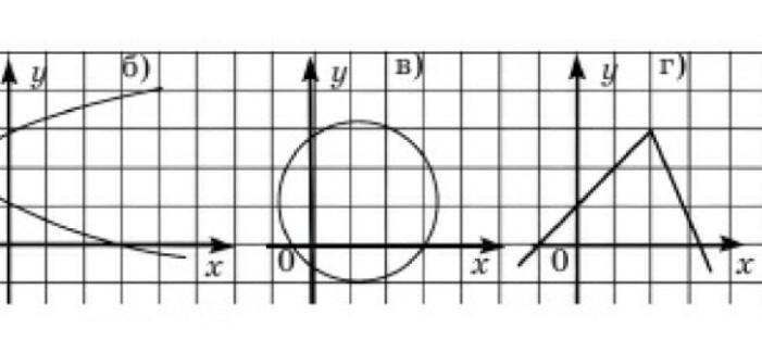 Функция - это график, где у любого х только одно значение у. Если провести вертикальную линию, которая параллельна оси у, и она пересечёт график в двух точках, то это не функция. В б) и в) графики не являются функцией. Проведи вертикальную линию и увидишь, как она пересечёт две точки. В г) у нас функция, ибо у всех х по одному у