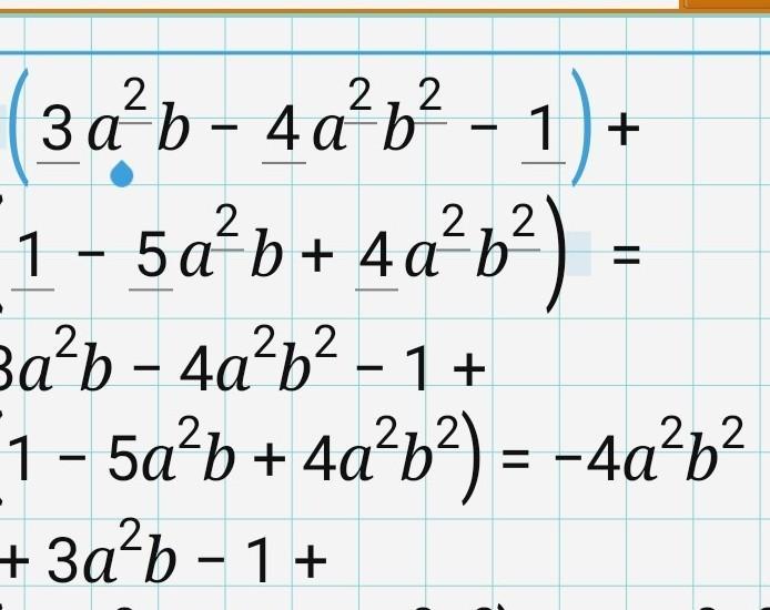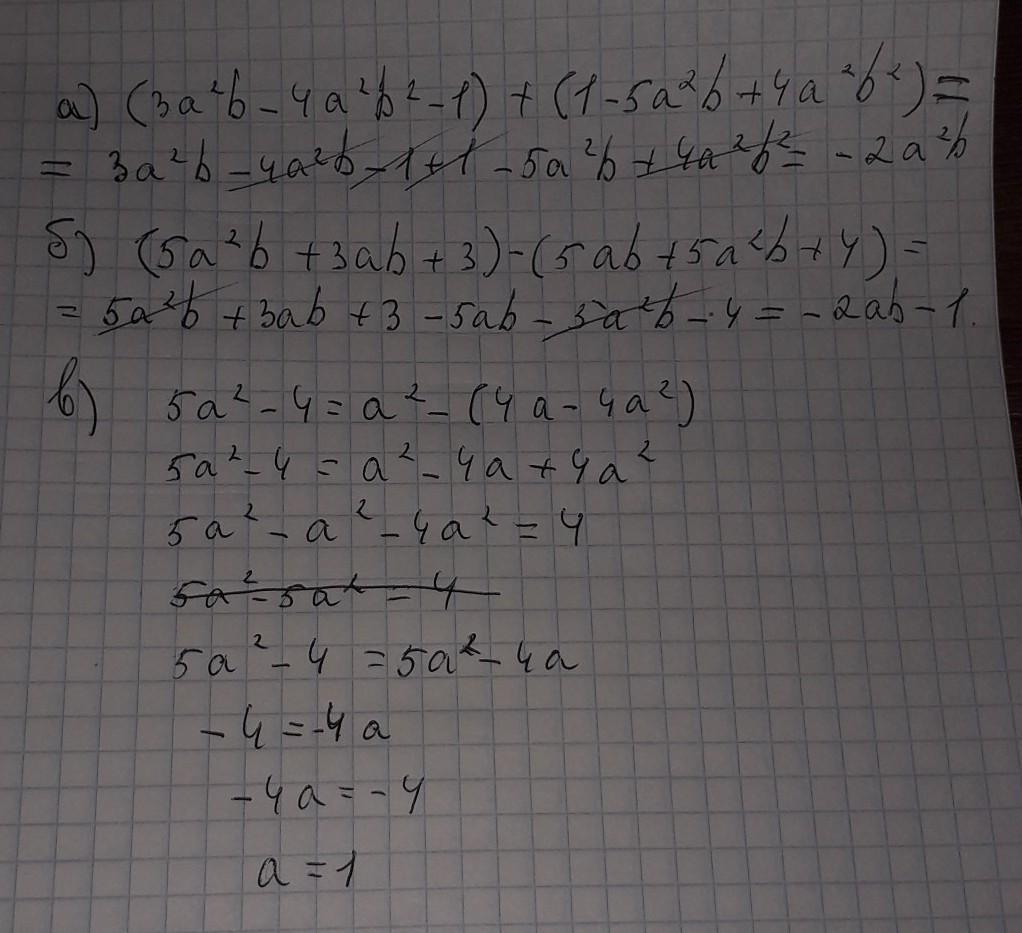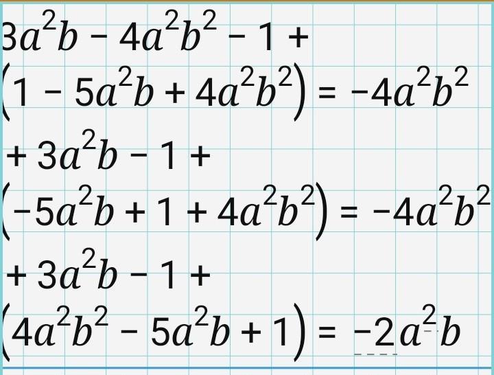 а) (3а^2b-4a^2b^2-1)+(1-5a^2b+4a^2b^2)