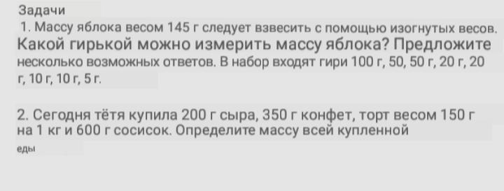 Массу яблока весом 145г следует взвесить с помощью изогнутых весов. какой гирькой можно измерить массу яблока? предложите несколько возможных ответов. в набор входят гири 100г, 50г, 50г, 20г, 20г, 10г, 5г (можно ещё второй сделать)
