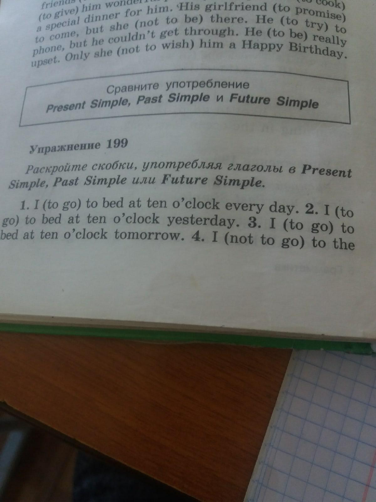 I go to bed at 10 o'clock everyday. I went to bed at ten o'clock yesterday.I will go to bed at ten o'clock tomorrow. I don't go to the cinema every day. I didn't go to the cinema yesterday. I will not go to the cinema tomorrow