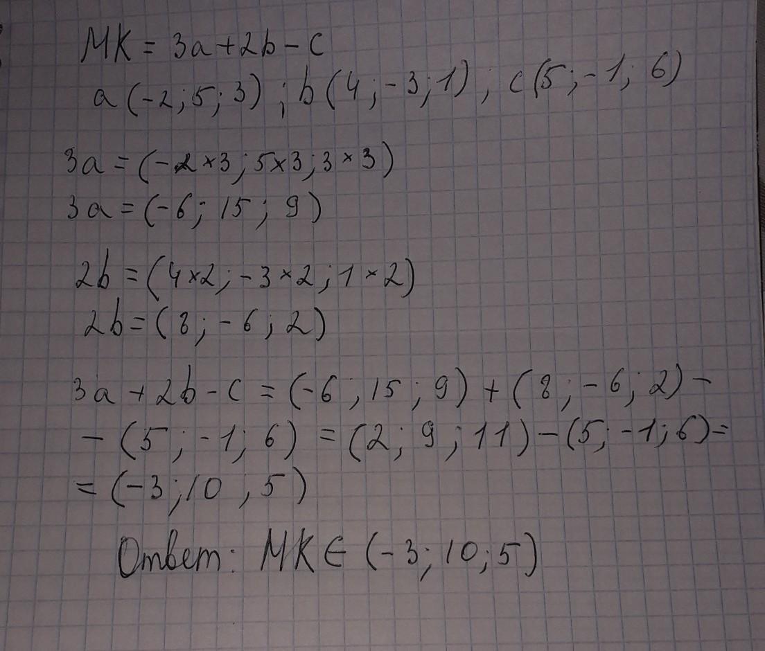 задание. 1. Найти координаты вектора МК, если МК = 3а+2в - с, где а (-2;5;3). В) (4;-3;1), с(5; -1; 6). прошу помогите, пожалуйста
