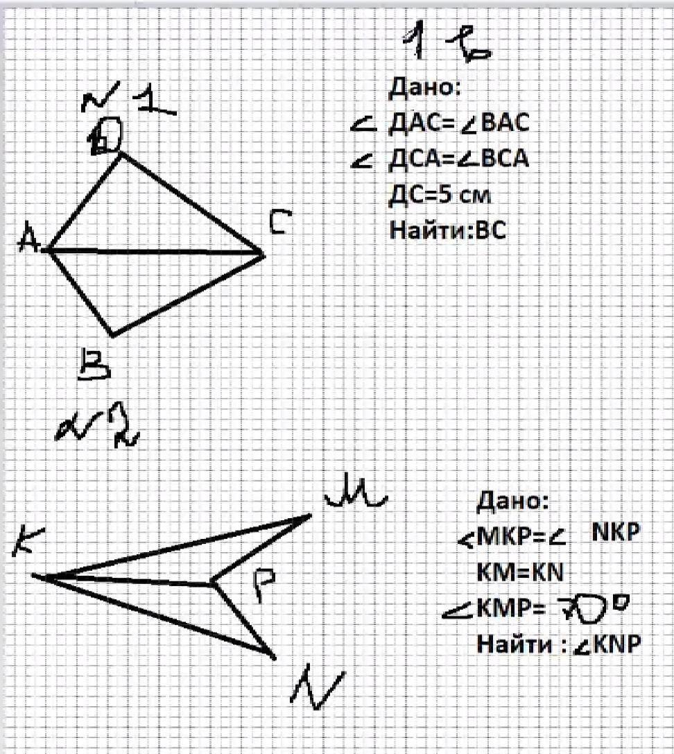 Т.к. дано, что угол DАС = углу ВАС и угол DCA = углу ВСА, а DС = 5, то по св-ву о равенстве треугольников по 3м элементам (в данном случае строна и 2 прилежащих к ней угла), находим, что BC = 5