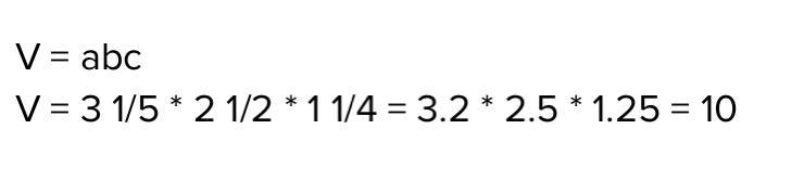 найдите объём прямоугольного паралепипеда, длина которого 3 1/5 метра, ширина 2 1/2, высота 1 1/4