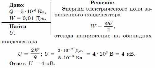1. При сообщении конденсатору заряда 5‧10^-6 Кл его энергия оказалась равной0,01 Дж. Определить напряжение на обкладках конденсатора.
