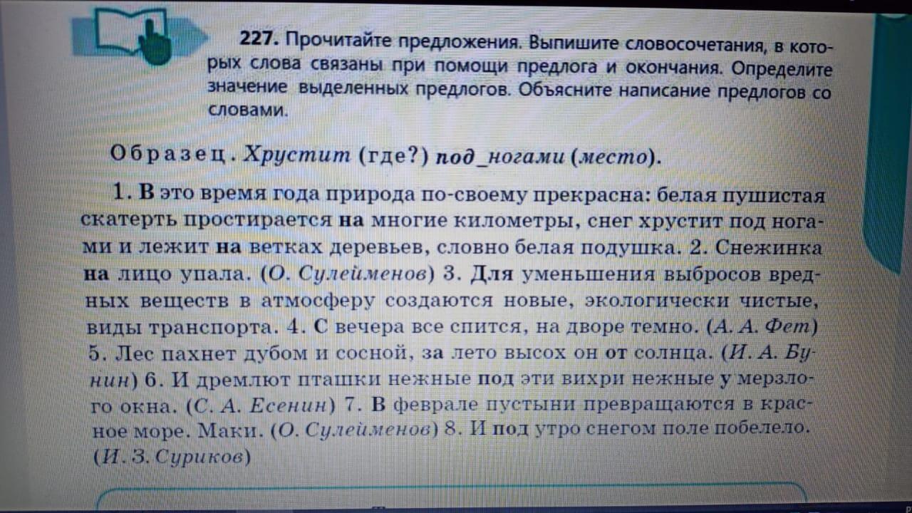 1. В (какое?)это время(время). Лежит (где?) на ветках(место). 2. Снежинка упала (куда?) на лицо (место). 3. Создаются (для чего?) для уменьшения выбросов (цель). 4. Спится (когда?) с вечера (время) 5. Лес пахнет (чем?) дубом и сосной(дополнение). Высох (от чего?) от солнца (причина). 6. Дремлют (где?) у окна. 7. Превращаются (когда?) в феврале 8. Побелело (когда?) под утро(время).