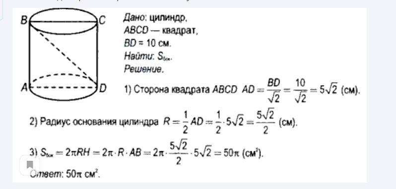 Осевое сечение цилиндра - квадрат, длина диагонали которого равна 10 см. Вычислите площадь боковой поверхности цилиндра. Число пи принимать примерно равным 3.