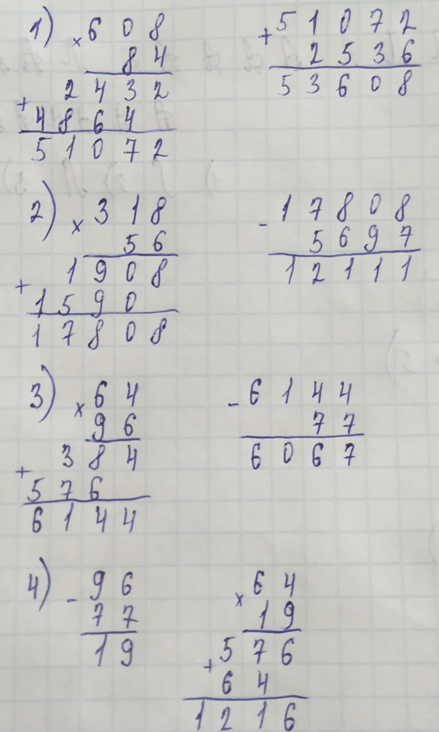 помогите решить СТОЛБИКОМ 1. 608*84+2536 2.318*56-5967 3.64*96-77 4.64*(96-77) КТО БЕЗ СТОЛБИКА ЗДЕЛАЕТ БАН