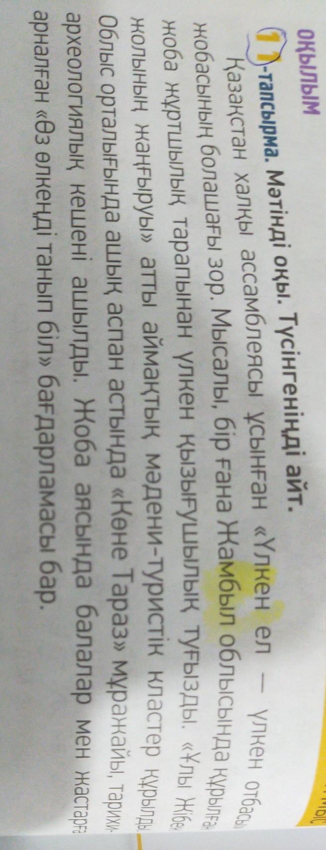 Ответ:Қазақстан елінің Үлкен ел жобасының мақсаты зор. Мысалы, бір Жамбыл облысында жоба жұртшылық тарапынан көп қызығушылық болды. " Ұлы Жібек жолының жаңғыруы атты класстар құрылды. Облыс орталығында" көне Тараз" мұражайы, тарихи археологиялық кешені ашылды. Тағы да, жастарға арналған "Өз еліңді танып біл" бағдарламасы бар екенін білдім.