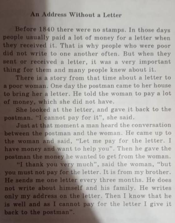 Адрес без письма.До 1840 года марок не было.В те времена люди обычно платили большие денги за письмо,когда получали его.Вот пачему бедные люди не часто писали друг другу.Но когда они отправляли или получали письмо,это было очень важно для них,и много люди об этом знали.С тех пор есть история о письме бедной женщине.Однажды почтальон пришел к ней домой,чтобы принести ей письмо.Он сказал женщине заплатить много денег,которых у нее не было.Она посмотрела на письмо и вернула его почтальону.<<Я не могу заплатить за это>>,сказала она.Как раз в этот момент мужчина услышал разгавор почтальона и женщины.Он подошел к женщине и сказал:<<Позвольте мне оплатить письмо>>.У меня есть денги,и я хочу вам помочь>>За тем он отдал почтальону денги которые хотел получить от женщины.<<Большое спасибо вам,сказала женщина-но вы не должны платить за письмо.Оно от моего брата.Он присылает мне одно письмо каждые три месяца.Он не пишет о себе и семье.Он пишет толька мой адрес в письме.Тогда я знаю,что он здоров,и так как я не могу заплатить за письмо,я возвращаю его почтальону