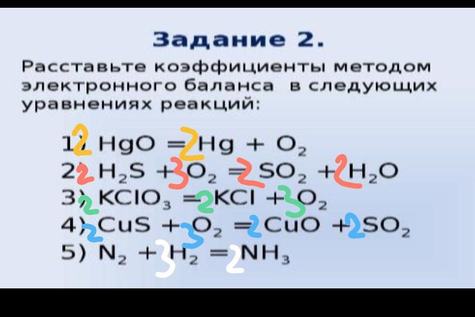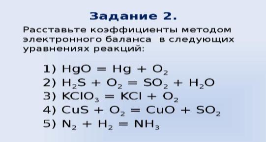 Как уровнять? Нужно сделать так, чтобы количество одного элемента перед равно было равно количеству этого же элемента за равно. То есть если брать 1 уравнение возьмём O. Его перед равно было 1, а за равно 2, соответственно ставим перед HgO цифру(коэффициент) 2. Тогда Hg у нас перед равно стало 2, а за знаком равенства Hg один. То значит, что за знаком равенства ставим перед Hg цифру 2.