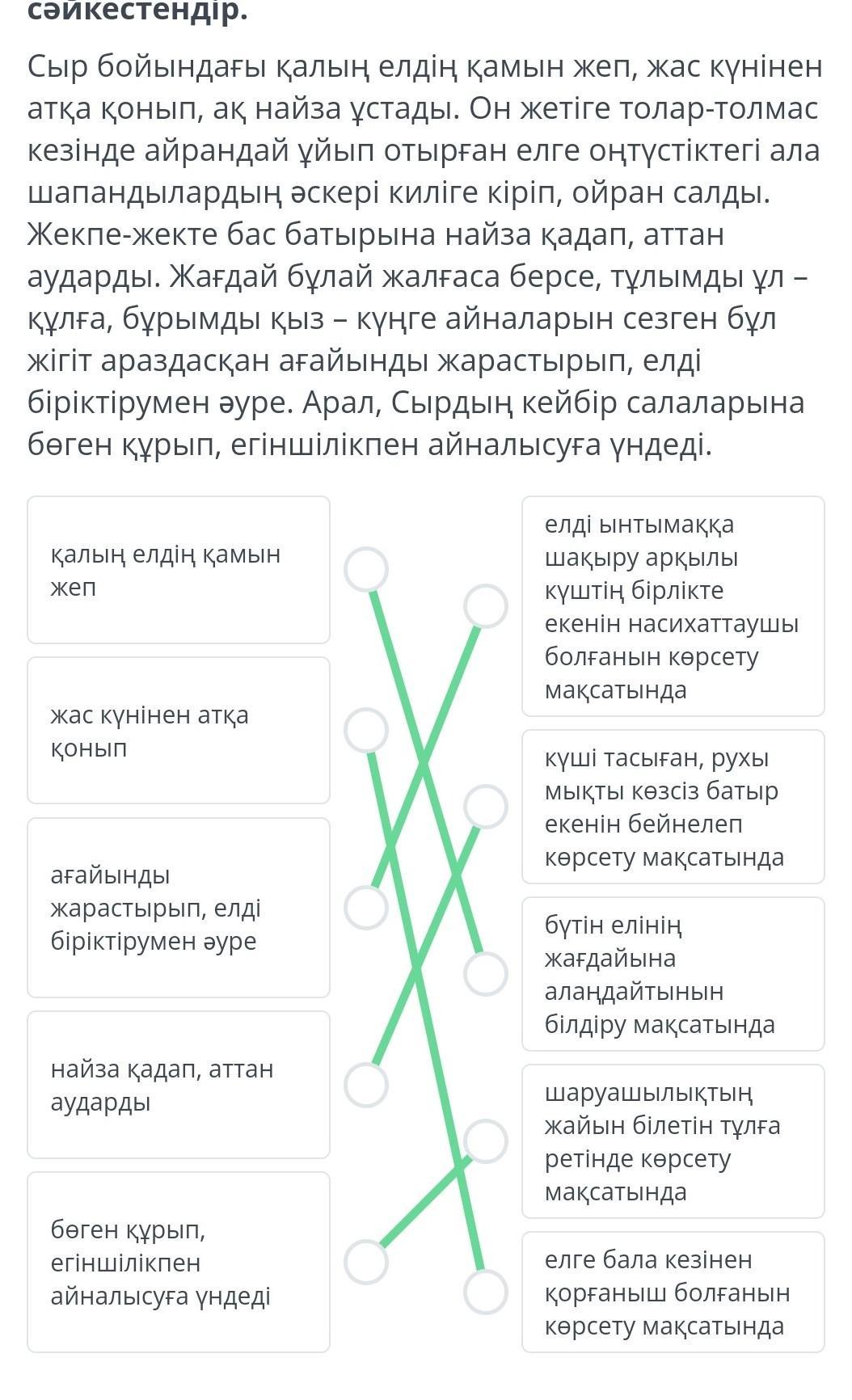 Үзіндідегі кейіпкер мінезін танытатын сөз тіркестерін анықтап, қолданылу мақсатымен сәйкестендір. Сыр бойындағы қалың елдің қамын жеп, жас күнінен атқа қонып, ақ найза ұстады. Он жетіге толар-толмас кезінде айрандай ұйып отырған елге оңтүстіктегі ала шапандылардың əскері киліге кіріп, ойран салды. Жекпе-жекте бас батырына найза қадап, аттан аударды. Жағдай бұлай жалғаса берсе, тұлымды ұл – құлға, бұрымды қыз – күңге айналарын сезген бұл жігіт араздасқан ағайынды жарастырып, елді біріктірумен əуре. Арал, Сырдың кейбір салаларына бөген құрып, егіншілікпен айналысуға үндеді.