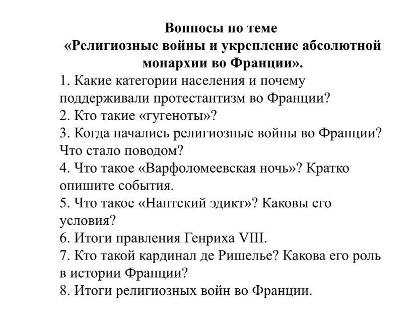 5. Нантский эдикт 1598 года - закон, подписанный французским королём Генрихом IV 13 августа 1598 года в городе Нант; завершил Религиозные (гугенотские) войны во Франции.