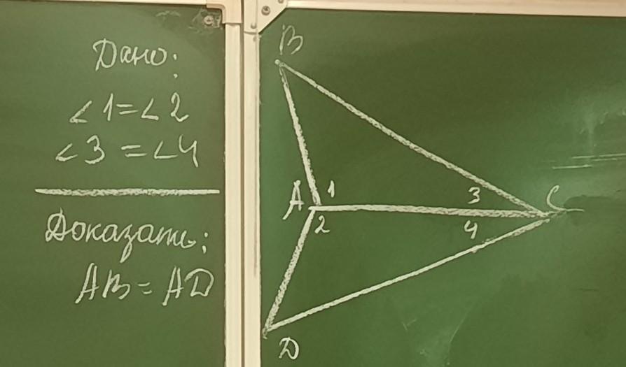 По признаку равенства треугольников (если сторона и два прилегающие к ней угла одного треугольника соответственно равны стороне и двум прилегающим к ней углам другого треугольника, то такие треугольники - уровне), треугольник АВС равен треугольнику АДС. Поэтому АВ = АД, как соответствующие стороны равных треугольников.