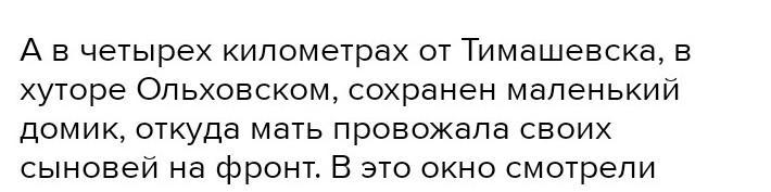 А в четырех километрах от Тимашевска, в хуторе Ольховском, сохранен маленький домик, откуда мать провожала своих сыновей на фронт. В это окно смотрели ее полные надежды и страха глаза, к этой калитке подходил почтальон с «похоронками»... До конца жизни Епистиния Федоровна не уставала до боли в глазах вглядываться в даль дорог. Ждала сыновей. До последнего своего часа. Гражданский подвиг Епистинии Степановой отмечен боевым орденом Отечественной войны первой степени, медалью материнства.