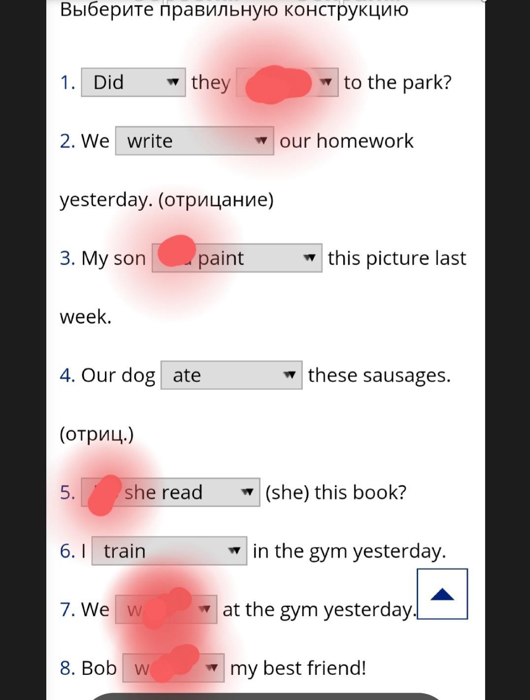Помогите пожалуйста! В 1, 7 и 8 предложениях. Там, где закрашено красным, нужно либо поставить глагол в past simple, либо сделать отрицание, либо в вопросе поставить did.