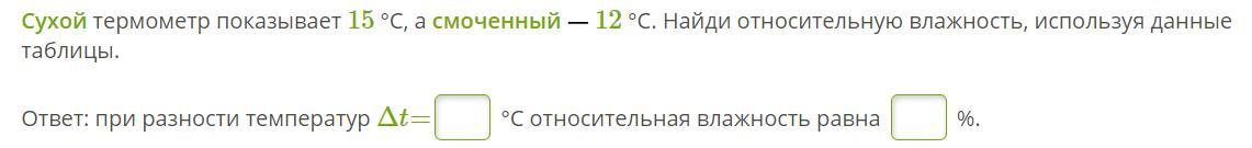 Сухой термометр показывает 15 °С, а смоченный — 12 °С. Найди относительную влажность, используя данные таблицы. Ответ: при разности температур Δt= °С относительная влажность равна %.