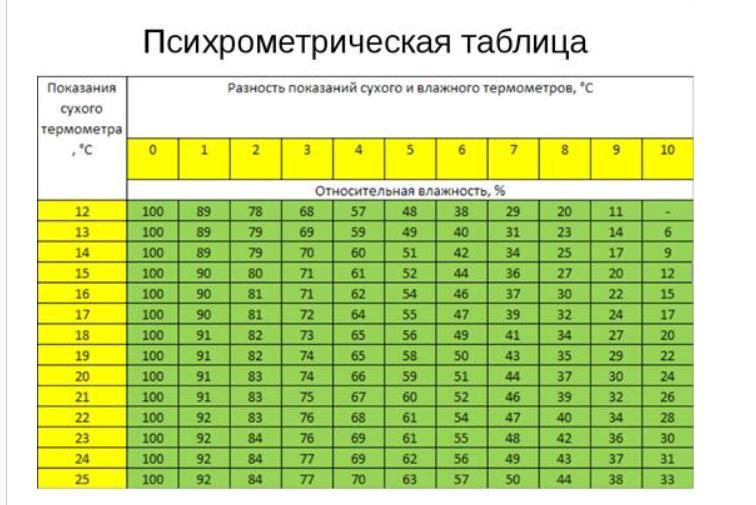 Если сухой термометр показывает 16, а разница с показаниями другого 3, то тоже будет 71%. Смотри по таблице