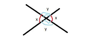 Сумма всех углов при пересечение двух прямых 360, и по теореме образуется две пары равных вертикальных углов. Пусть один угол x, а другой y, тогда