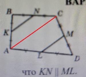 Соедините точки А и С, получите два треугольника АВС, в котором КN- средняя линия, и треугольник АDC, в котором LM-средняя линия. Обе средние линии по свойству средних линий параллельны основанию АС, но тогда они параллельны между собой. Доказано.