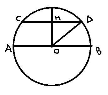 a) Расстояние до хорды измеряется перпендикуляром, оопущенным из центра окружности к хорде. По свойству хорд радиус, перпендикулярный к хорде, делит эту хорду пополам. CH=HD=CD/2=9см. OD-радуис = AB/2=15см. По теореме Пифагора находим