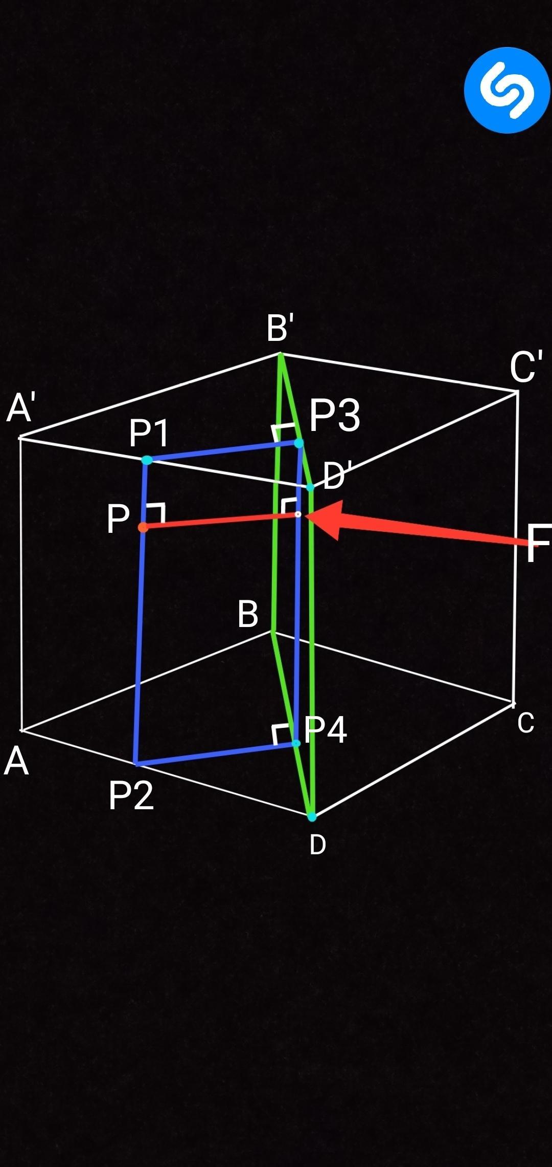5) прямая P3P4 принадлежит плоскости B'BD, а PF принадлежит плоскости P1P2P4, следовательно, прямая PF перпендикулярна плоскости B'BD и является перпендикуляром к ней, опущенным из точки P