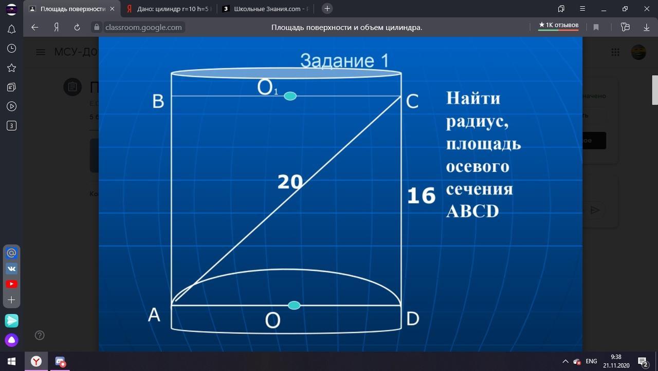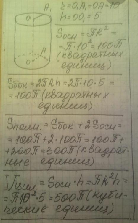 Дано: цилиндр r=10 h=5 Найти: Sосн, Sбок, Sцил, Vцил