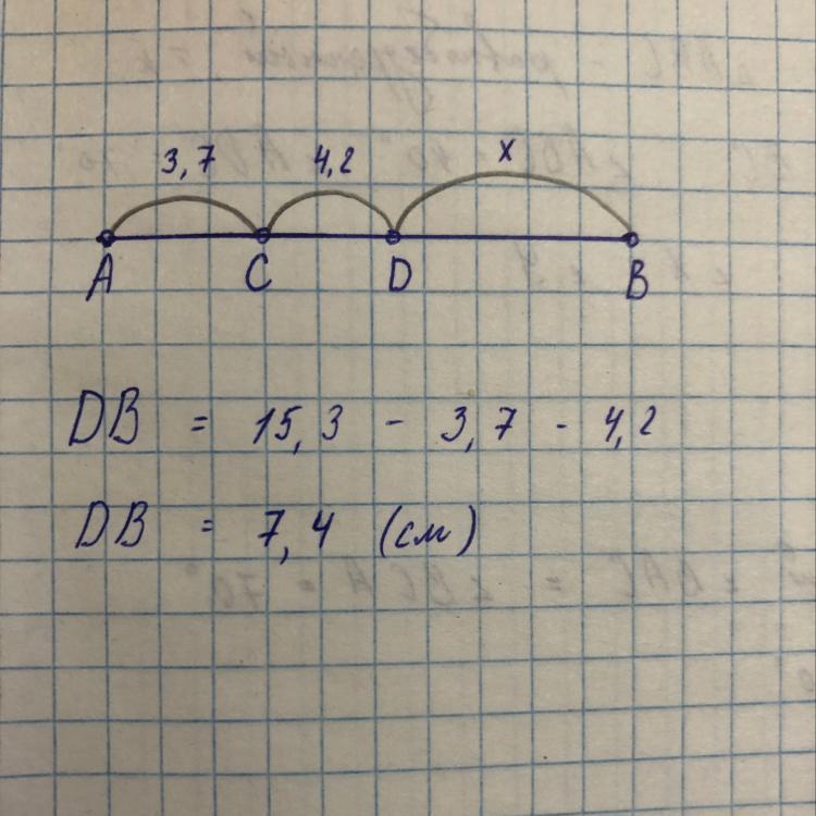 на отрезке АВ длиной 15,3 см взяты точки С и D так, что АС 3,7 см, СD 4,2 см. Найдите длину отрезка BD.
