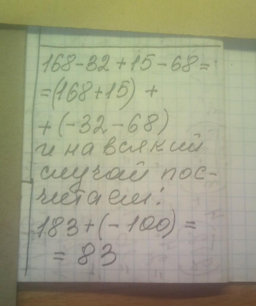 168-32+15-68=168+(-32)+15+(-68)=(168+15)+((-32+(-68))=183+(-100)=83