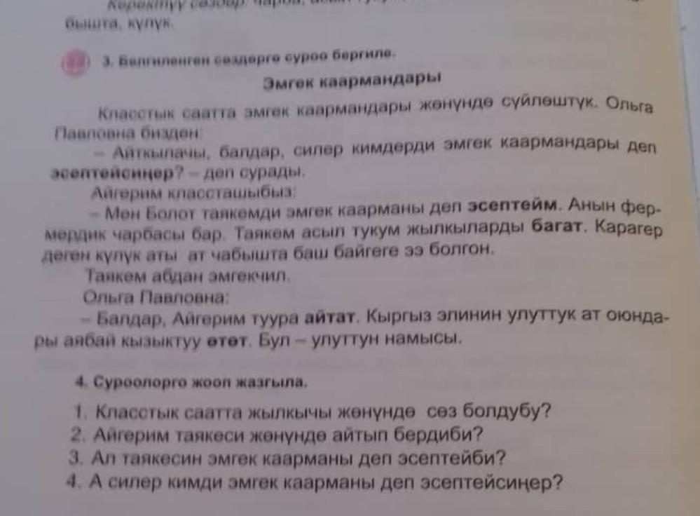 4-конугуу. 1. Ооба, жылкылар жөнүндө соз болду. 2.Айгерим таякеси жөнүндө айтып берди. 3.Ооба. 4.(Бул суроого озунуздор жаазып корунуздор)