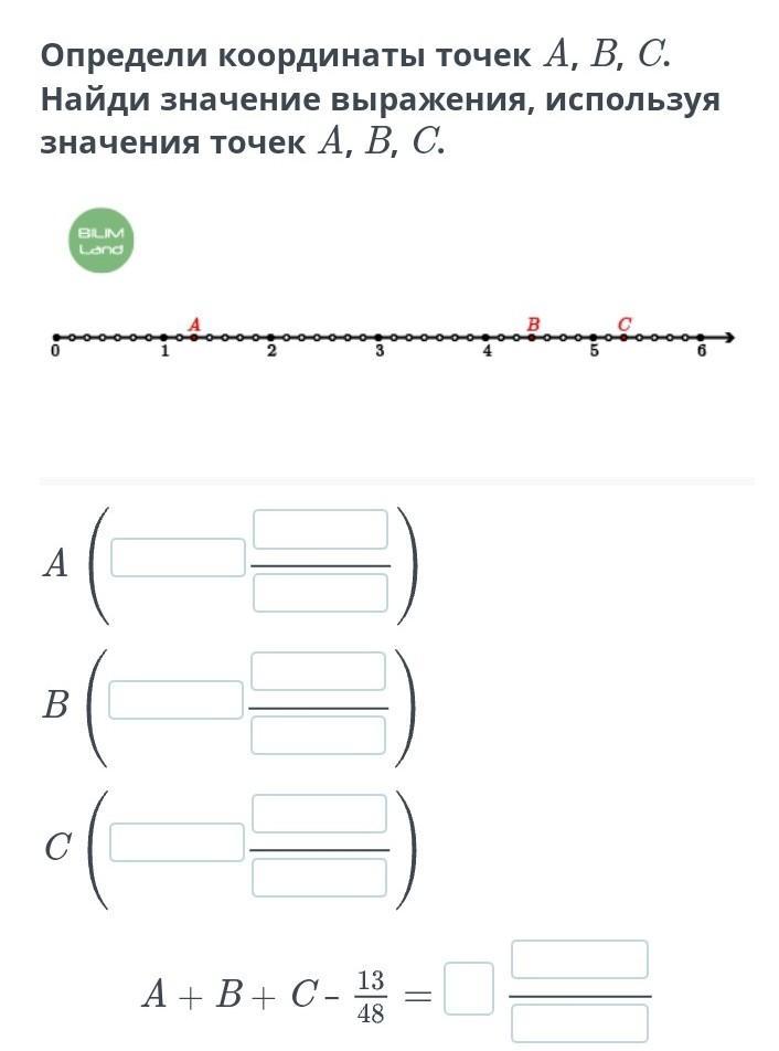 А - на второй точке из 7 после 1 целой, поэтому ее координата ; В - на 3-й точке из 7 после 4-х целых, тогда ее координаты