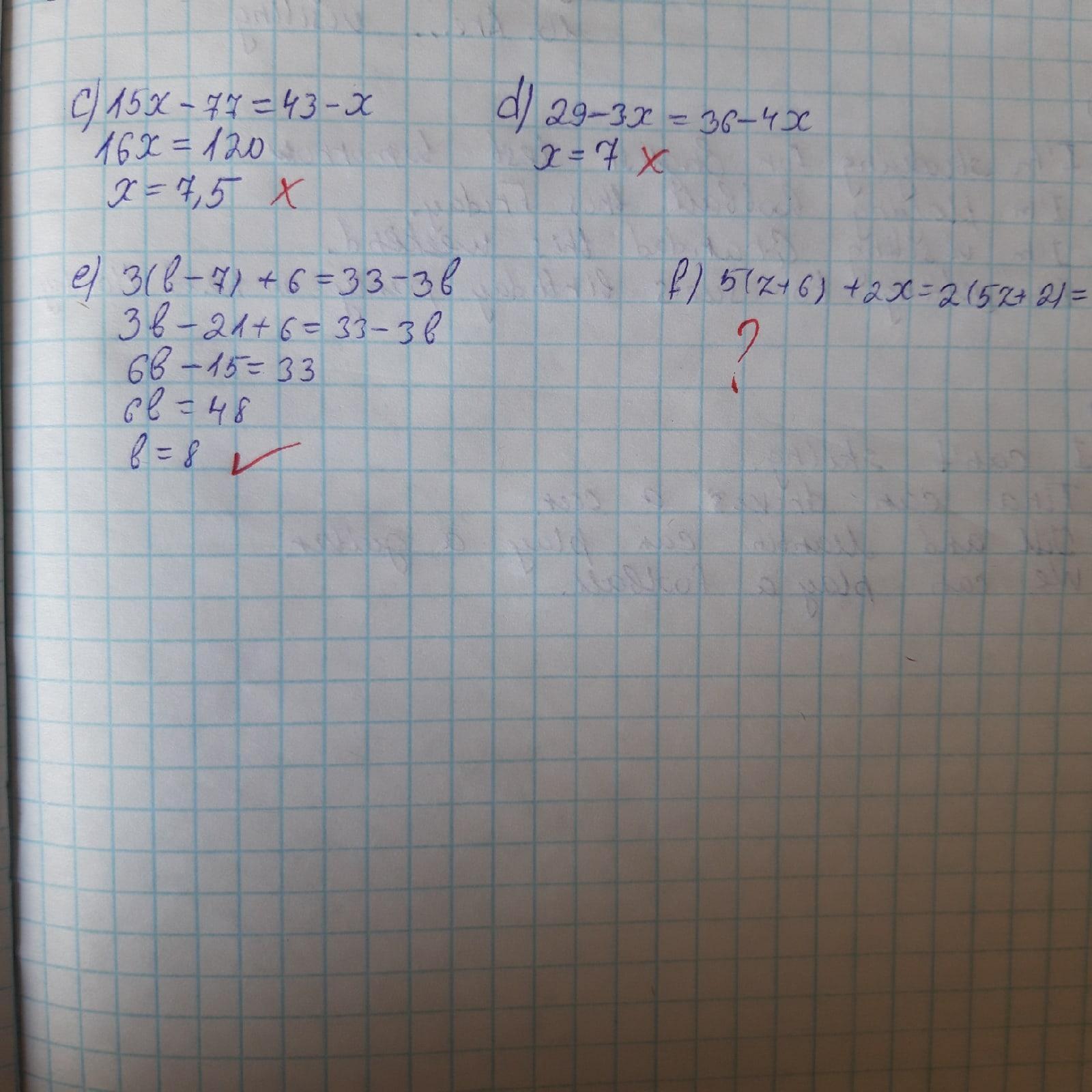 Является ли число 8 корнем следующих уравнений с)15х-77=43-х d)29-3x=36-4x e)3(b-7)+6=33-3b f)5(z+6)+2x=2(5z+2)=47
