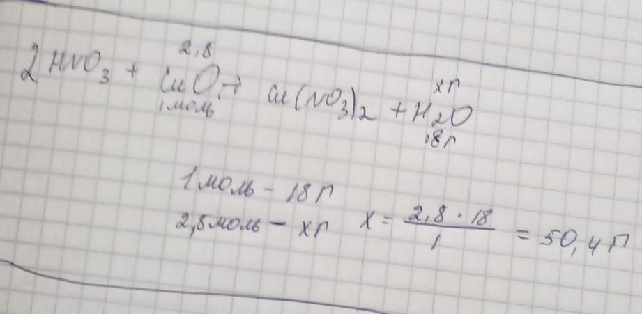 В реакции с азотной кислотой прореагировало 2,8 моль оксида меди (ll). Найдите массу (г) получившейся в результате реакции воды.