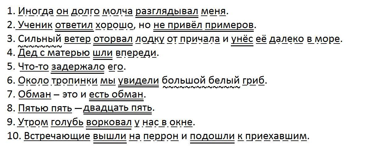 7. Обман это и есть обман. 8. Пятью пять двадцать пять. 9. Утром голубь ворковал у нас в окне. 10. Встречающие вышли на перрон и подошли к приехавшим.