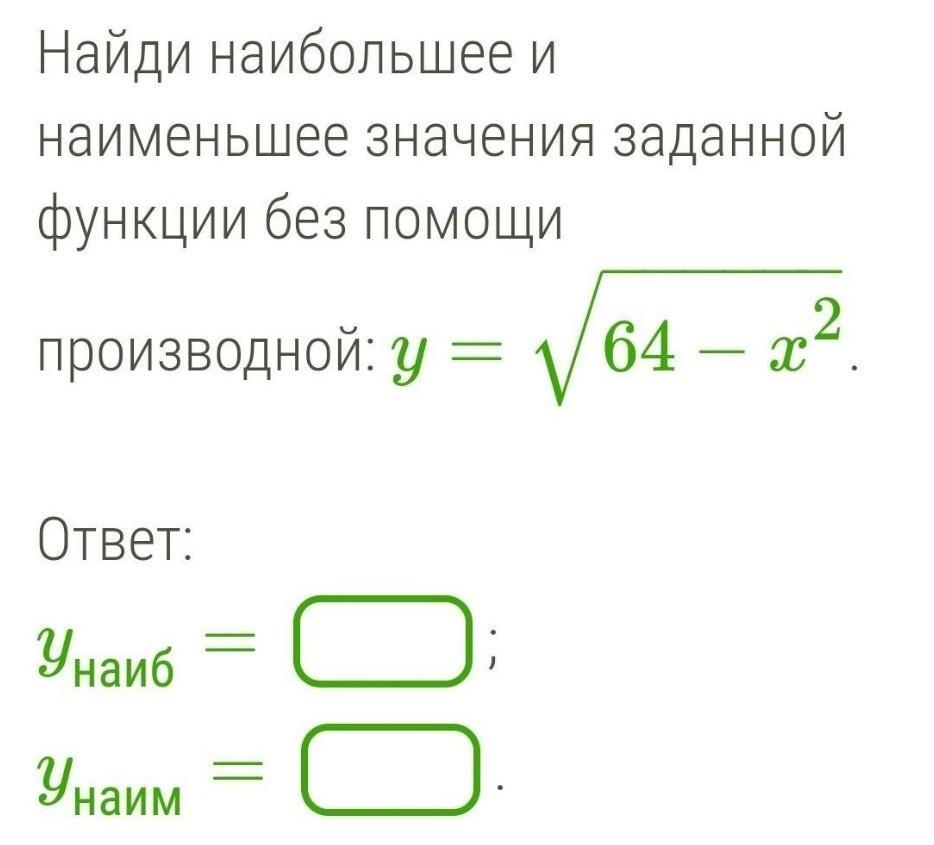 Чтобы найти y(наим), нужно вспомнить, что из корня всегда выйдет положительное число и поэтому ноль - опять таки лучший вариант для y. Для этого х должен быть равен 8 или -8.
