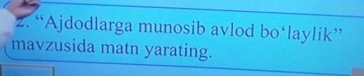 Biz yoshlar shu aziz va muqaddas yurtning farzandlarimiz. Biz shu tug'ilib o'sgan zaminimiz, ona Vatanimizdan o'la-o'lguncha qarzdormiz. Shu bilan birgalikda biz shunday tinch, osmoni musaffo, tunlari osuda Vatanda tug'ilganimizdan, shu yurtning farzandi ekanligimizdan faxrlanamiz.Bizning Yurtimizda buyuk ajdodlarimiz o'tgan: Amir Temur , Jaloliddin Manguberdi, Alisher Navoiy , Zaxiriddin Muhammad Bobur, Al-Xorazmiy, Imom Buxoriy kabi ko'plab ajdodlar olimlar o'tgan.Biz u ajdodlarimizga munosib avlob bo'lishimiz kerak , ularga o'xshashimiz uchun biz ko'plab o'qish kerak bo'ladi , lekin faqatgina o'qish emas balki sport bilan shug'ullanishimiz kerak.Agar biz o'qisak izlansak , sog'lom bo'lsak biz ajdodlarimizga munosib avlob bo'lamiz.Va u bilan birga bizning ajdodlarimizni qilgan ishlari haqida ham o'rganishimiz kerak, masalan A.Navoiy she'rlar dostonlar yozgan ularning yozgan dostonlarini sherlarini o'qishimiz va ulardan hulosa chiqarishimiz kerak.Ajdodlarga munosib avlod bo'laylik!