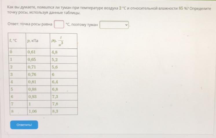 Как вы думаете, появится ли туман при температуре воздуха 2 °С и относительной влажности 85 %? Определите точку росы, используя данные таблицы.